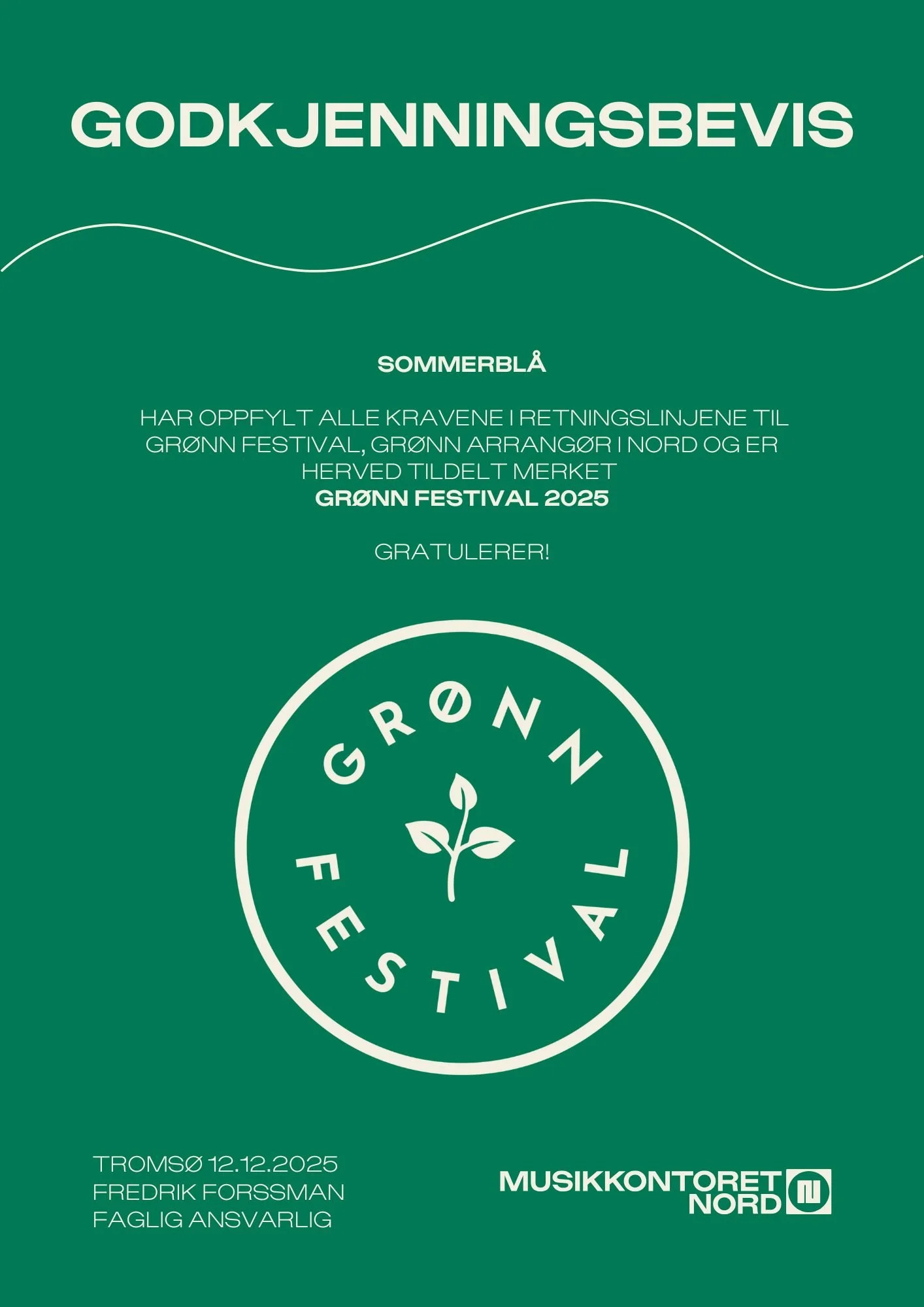Sommerblå har blitt tildelt merket Grønn festival, en anerkjennelse som gis til arrangementer som jobber systematisk og målrettet med bærekraft. Dette betyr at vi tar konkrete grep for å redusere vårt miljøavtrykk – blant annet gjennom ansvarlig avfallshåndtering, bærekraftige innkjøp, grønnere transportløsninger og bevisst energibruk. Merket forplikter oss til kontinuerlig forbedring, slik at vi kan skape gode festivalopplevelser med omtanke for både mennesker og miljø.